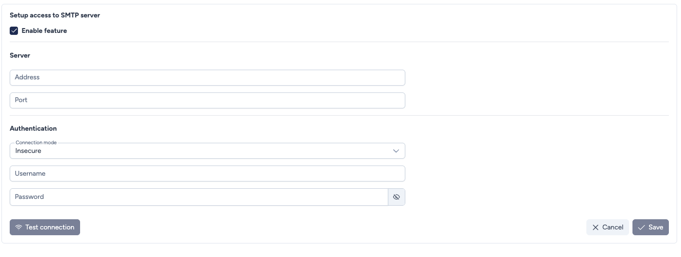 • Enable feature: Checkbox to activate or deactivate the use of the configured SMTP server throughout the application.