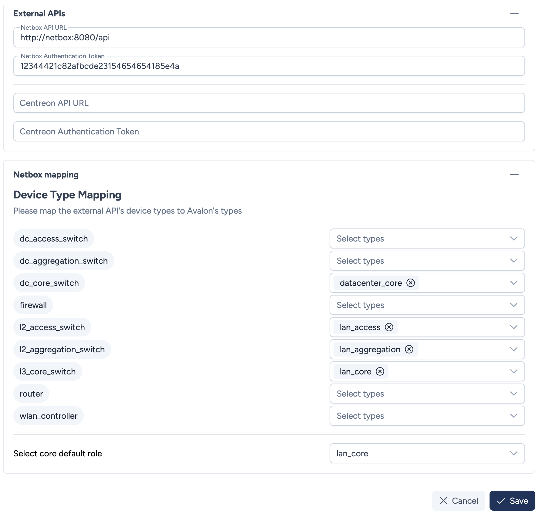Once you have configured both mandatory information, you will be able to create a mapping between Avalon's device types and Netbox's device roles: