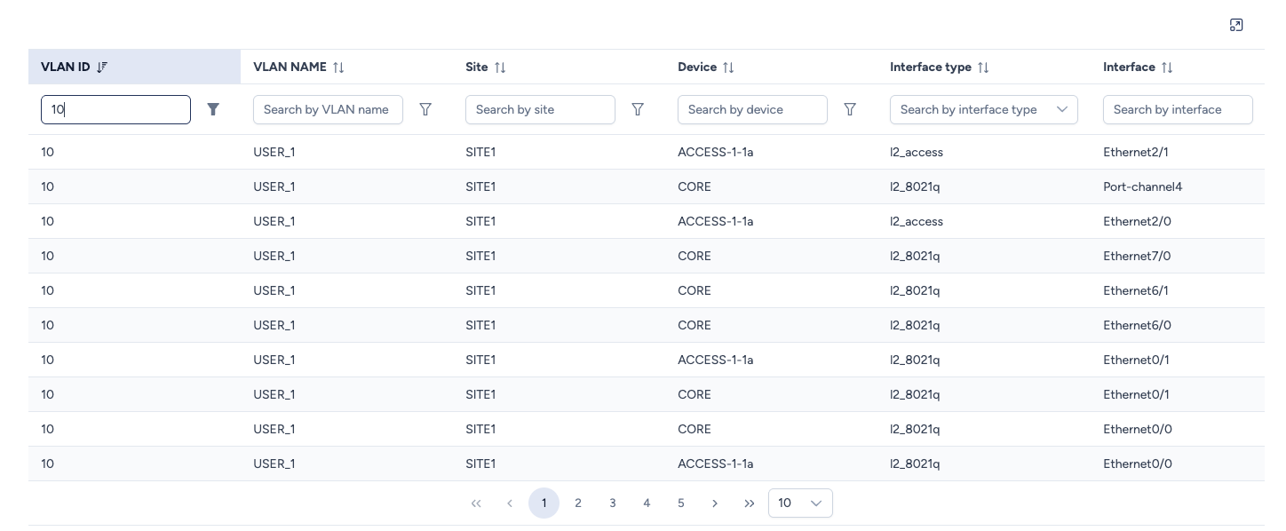 • Filtering: Use the search bars at the top of each column to quickly find where a specific VLAN (e.g., ID 10) is deployed or to list all Trunk ports (l2_8021q) on a specific switch.