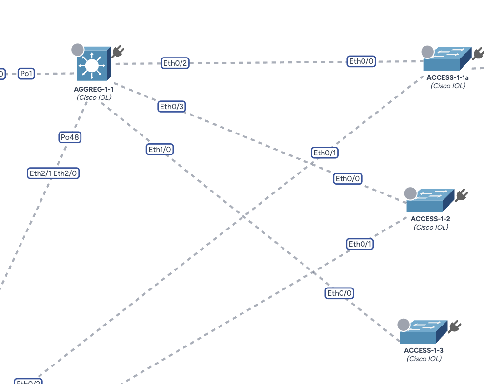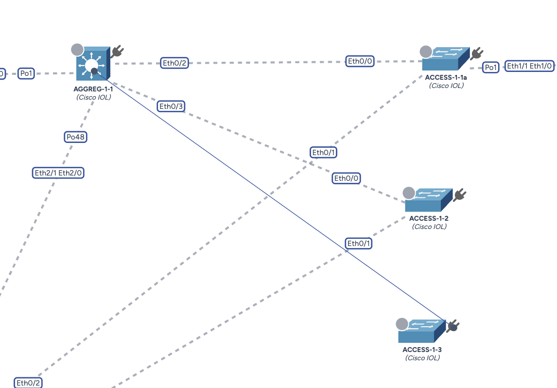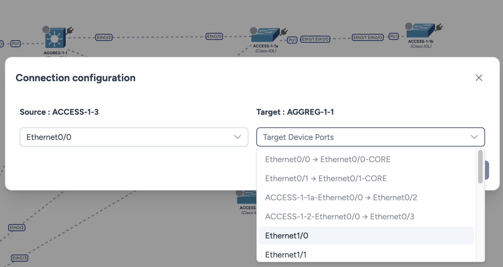 In this example, we have positioned the new switch ACCESS-1-3 into the "B1" area and we want to uplink it to the distribution switch AGGREG-1-1.