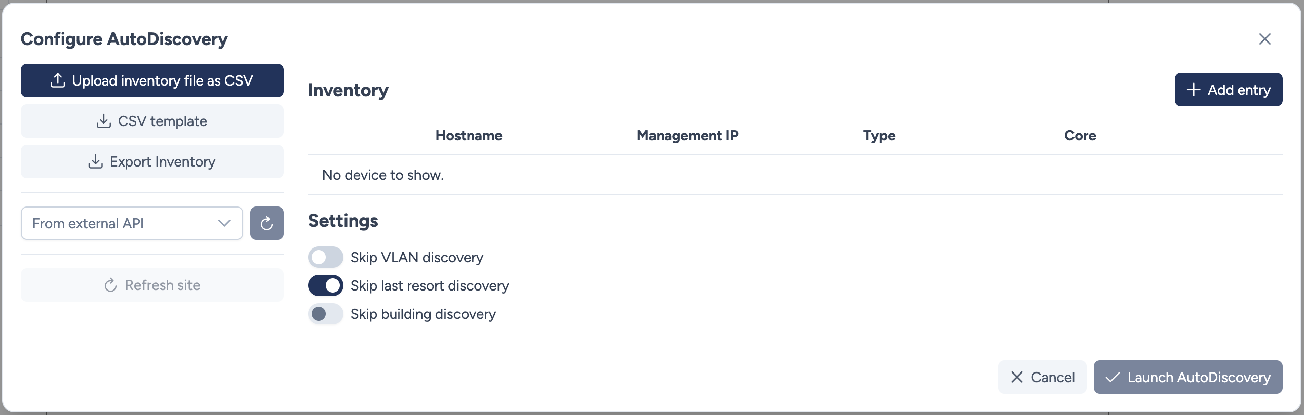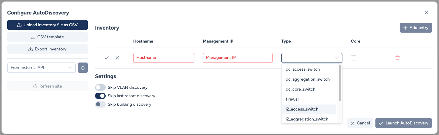 This modal allows you to configure and trigger the discovery process to populate your site with network devices.