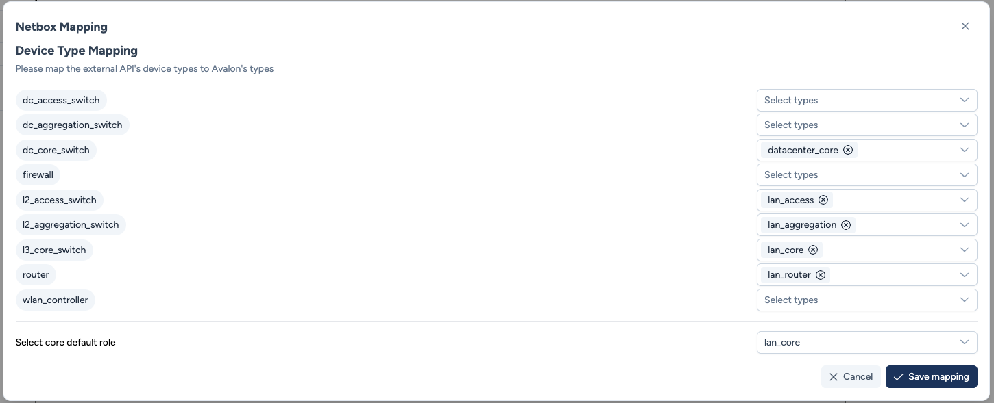 • Device Type Mapping: For each Avalon type (e.g., l2_access_switch), select one or more Netbox Roles (e.g., lan_access, switch_stack) from the dropdown.