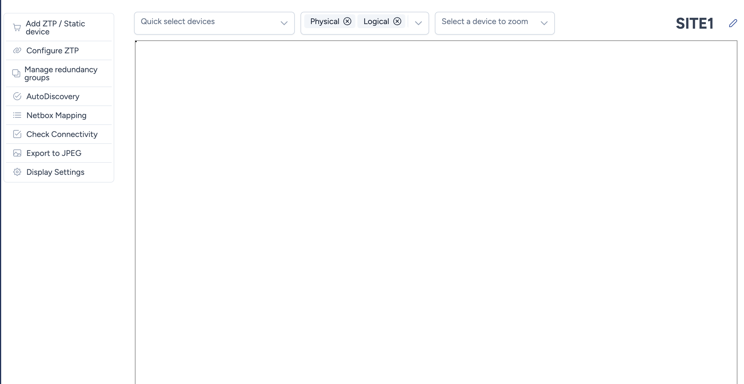 This page serves as the central dashboard for a specific Site. It offers an interactive topological view of your network, along with tools for device management, discovery, and visualization.