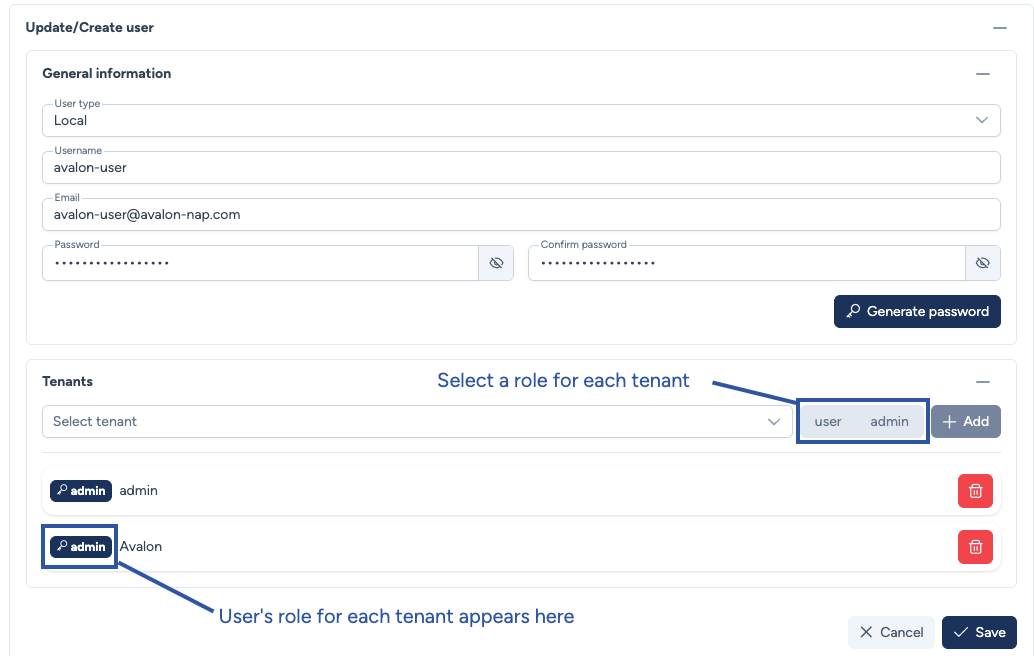 The last part of the user's configuration is to assign him to tenants and for each tenant specify a role: